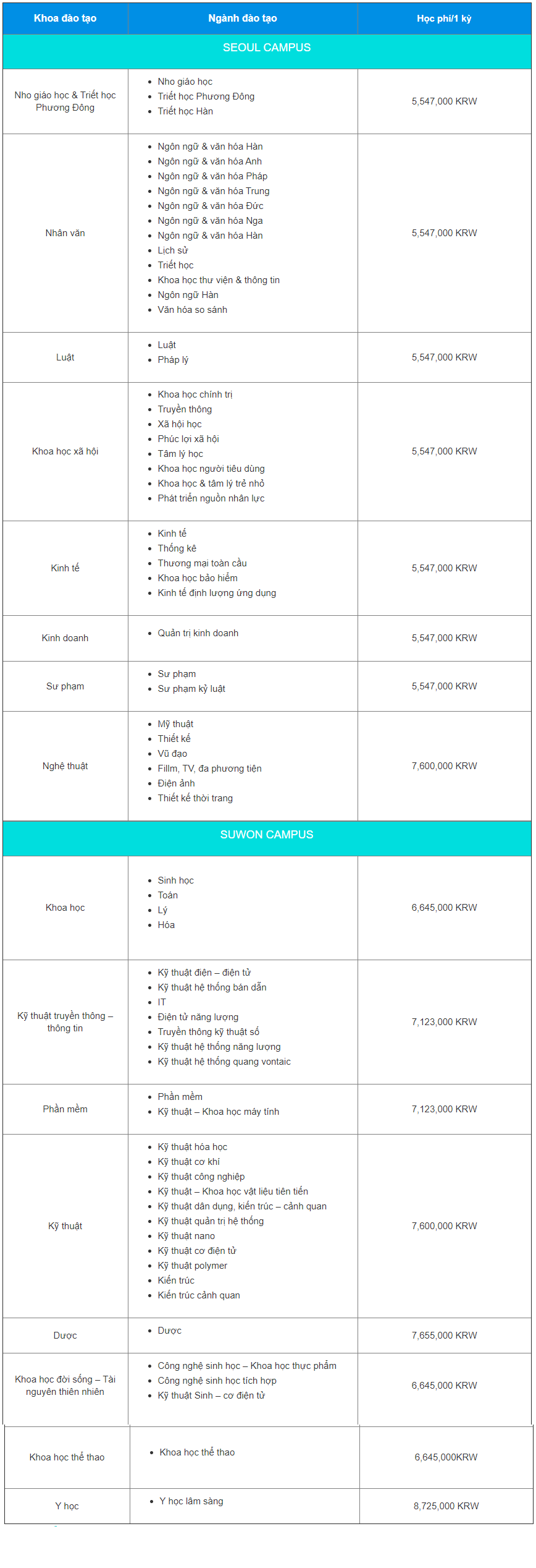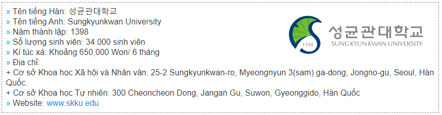 Trường đại học Sungkyunkwan Hàn Quốc – 성균관대학교 là ngôi trường lâu đời nhất của Hàn Quốc. Nếu các bạn đã xem các bộ phim cổ trang Hàn Quốc thì không khó nhận ra đây là nơi các sĩ tử, các vị quan bậc nhất đời Joseon đều theo học. Sungkyunkwan nhận đầu tư rất lớn từ tập đoàn SAMSUNG. Với cở sở vật chất hiện đại, đầy đủ nhằm tạo nên một môi trường học tập tốt nhất và thực tế nhất cho sinh viên.