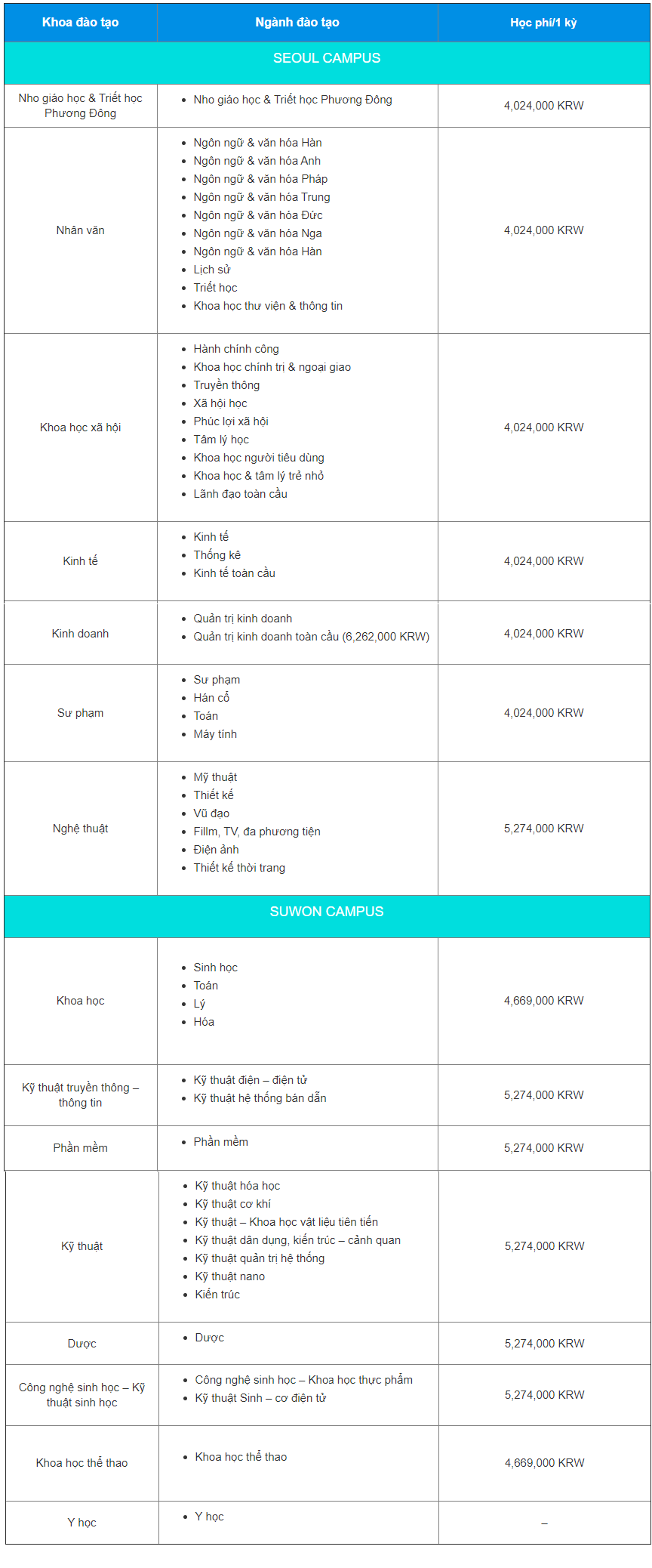 Đến nay, trường đã mở rộng ra thành hai cơ sở, địa điểm chính – campus của các ngành Xã hội và Nhân văn tọa lạc ngay giữa trung tâm Seoul. Các ngành Khoa học Tự nhiên nằm ở campus tại Suwon, cách cơ sở chính 45 phút đi bằng xe bus hoặc 1 giờ nếu đi bằng tàu điện ngầm.