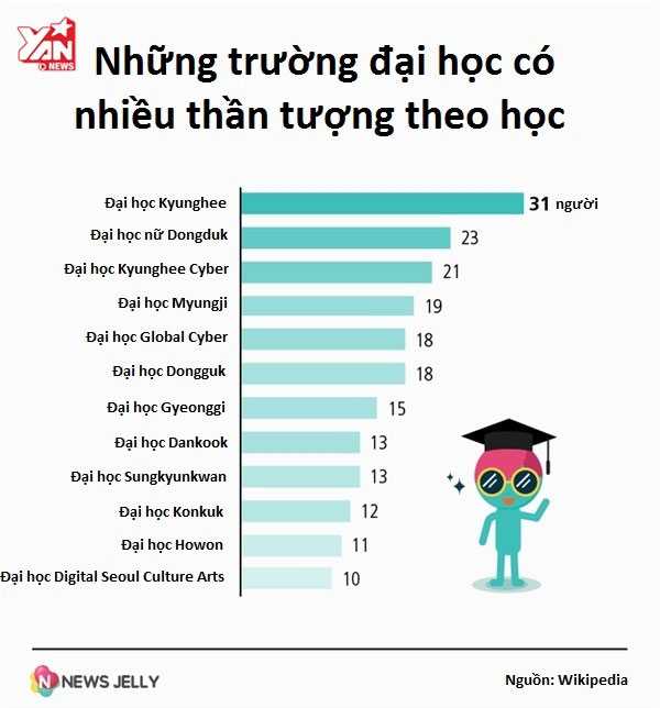 Đại học Kyunghee, Đại học nữ Dongduk và Đại học Kyunghee Cyber, Đại học Konkuk, Đại học Chungang chính là những trường đại học có số lượng thần tượng theo học nhiều nhất ở Hàn Quốc.