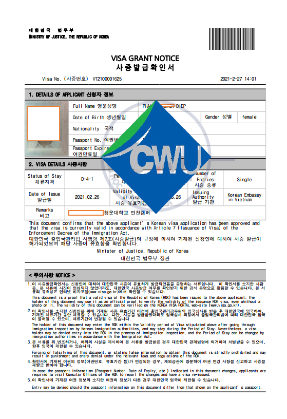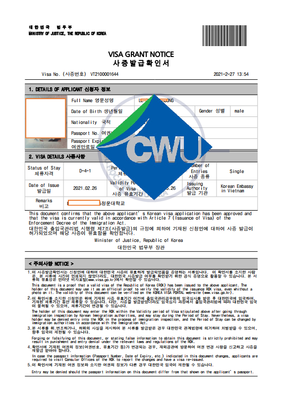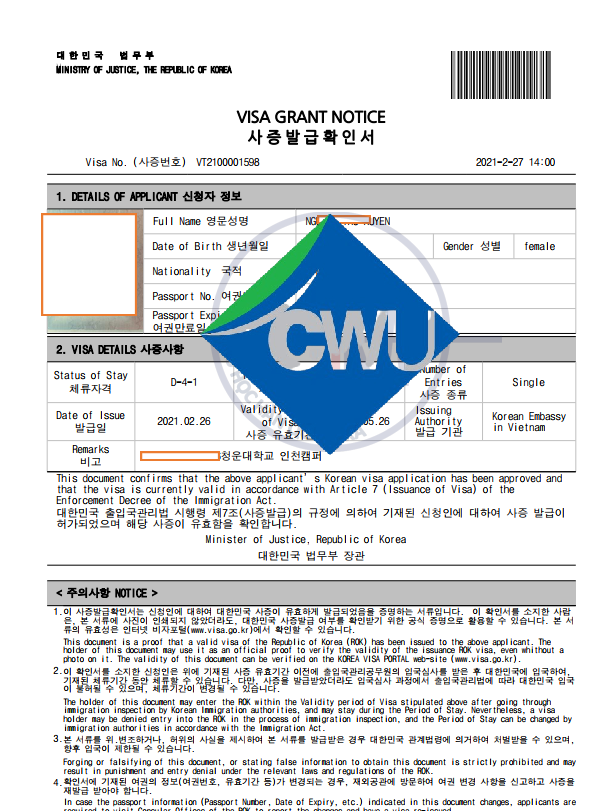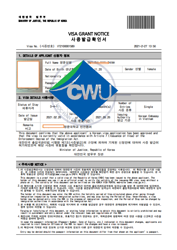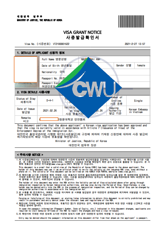 Trường top 1% ra visa nhanh và an toàn. Các em học sinh và các quý phụ huynh cùng tham khảo hình ảnh visa của 1 số học sinh trường đại học Chungwoon - top 1% nhé!
